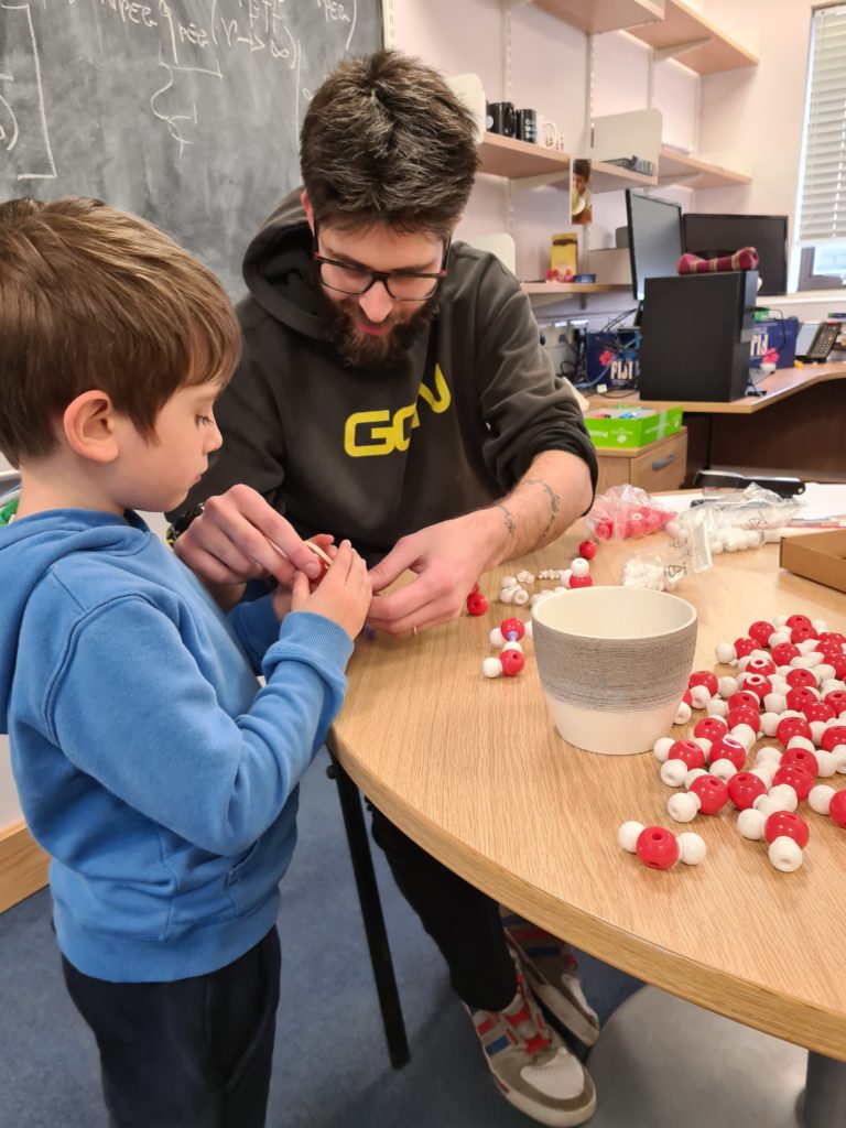 With this post I wanted to highlight something “different” with respect to the usual school visit and such. Meet Jack, an incredibly talented child, 6 years of age only and yet very knowledgable (and I really mean it!) about Chemistry, Physics, and more. Jack wanted to visit the Department to have a look at some actual equipment, so we went to “see” some lasers under the prime supervision of Prof. Stavros himself. After that, it was time to build some molecular models… yep – we built some ice (of course!), and some other crazy stuff as well.